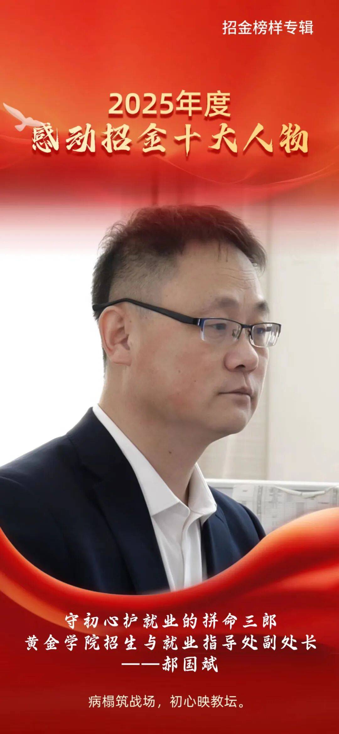 10月份,正值学院应届生生源数据填报最紧张的冲刺期,作为就业负责人的他却因严重车祸住院治疗。但这项工作直接关系到数千学生能否顺利就业,上报期限日益临近,全院上下心急如焚。病床上的他不顾钻心的疼痛和家人医生的再三劝阻,要来电脑、再扛重任。为了确保数据及时准确上报,他主动推迟了即将进行的手术,病房成了他的办公室。白天,他忍着剧痛,一遍遍打电话与各系沟通协调、核对信息;晚上,他让医生将受伤的左臂高高吊起,用右手艰难地敲击键盘,逐条录入、反复校验。连续多日的坚持与努力,终于换来全部数据零差错上报。直到这一刻,他才放心地被推进手术室。术后尚未完全恢复的他,再一次不顾劝阻、提前出院,转战招生工作中。又凭着这股不服输的劲头和对工作的执着坚守,他又超额完成完成招生任务量的200%。