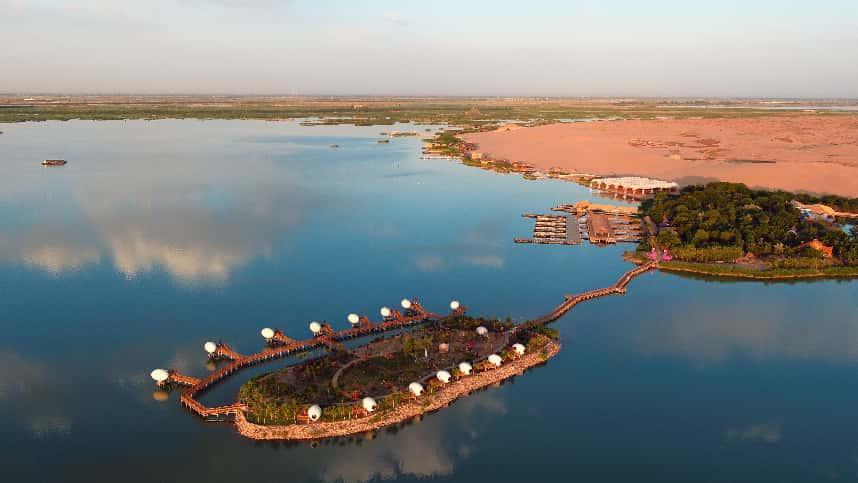 北纬38的石嘴山,是宁夏工业的发源地,也藏着塞上最独特的生态奇观。国家5A级景区沙湖以“沙水共生”闻名,沙丘如金、湖泊似玉,万只候鸟栖息的芦苇荡成为观鸟爱好者的天堂。工业旅游在此焕发新生,石炭井工业文旅影视小镇曾是《万里归途》《山海情》等40余部影视剧取景地,老旧厂房改造的大武口工业遗址公园、“石炭井号”绿皮火车,成为怀旧与潮流并存的打卡地。此外,北武当红叶、贺翔通航低空游览、贺东庄园葡萄酒品鉴,搭配大武口凉皮、沙湖大鱼头等特色美食,构建起“工业风+生态游”的多元体验。